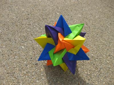 This is a 47th Stellation of Icosaherdron, by Meenakshi Mukerji. (60 piece module 12 X 5 colors needed) I call this 5 pyramids converging through each other if you look closely each color has 4 pointed of pyramids assemblies. I found a pretty fool proof methods when assembly it. diagrams (from www.origamiusa.org)explain how to fold and attach 3 pieces to make 4 units with each color with 12 papers all the same color 6" I used (12" diameter model) you will need 5 different colored papers. You then put 5 units (one of each color)to make a star with slightly sunken center then add one unit at a time to make other stars off of the first one. never putting the same color next to each other. making sure they match across from one another to make the next point of that colors pyramid. when you see how it all comes together then glue them on inside of flaps as your attaching them(so not as many ripples will show) making sure the other flaps are free from glue to insert in the next flaps. Once you follow these direction (not much is given in diagrams how configue units to make final model) you can assemble a simple but unique module like this? good folding!!